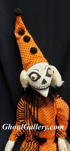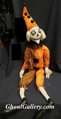 Creatively detailed, painted fabric. The Clown is long and thin at 40″ in length. He has Google eyes popping out of his head. You can see by the photos that there has been a lot oaf attention paid to his clown outfit. He is very ghoulish.