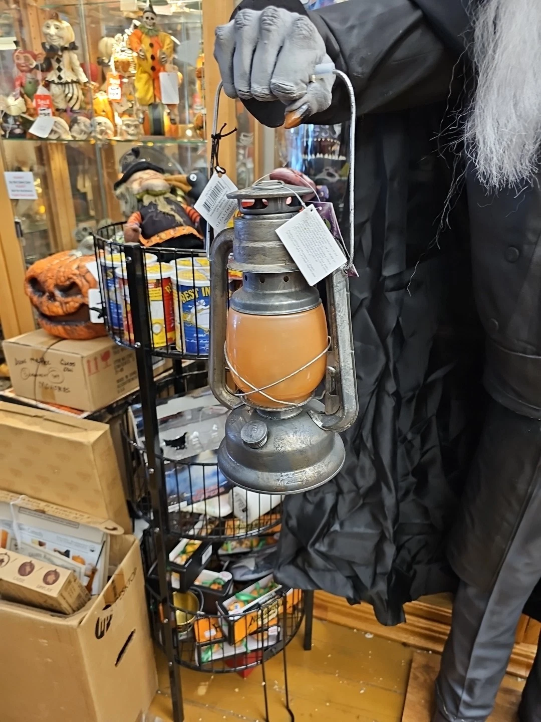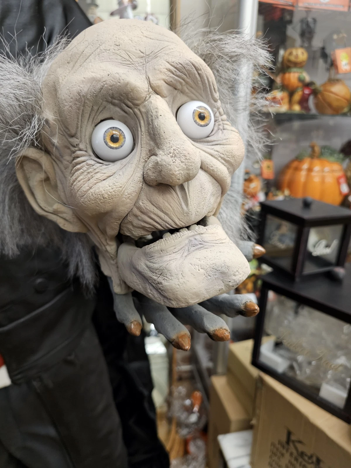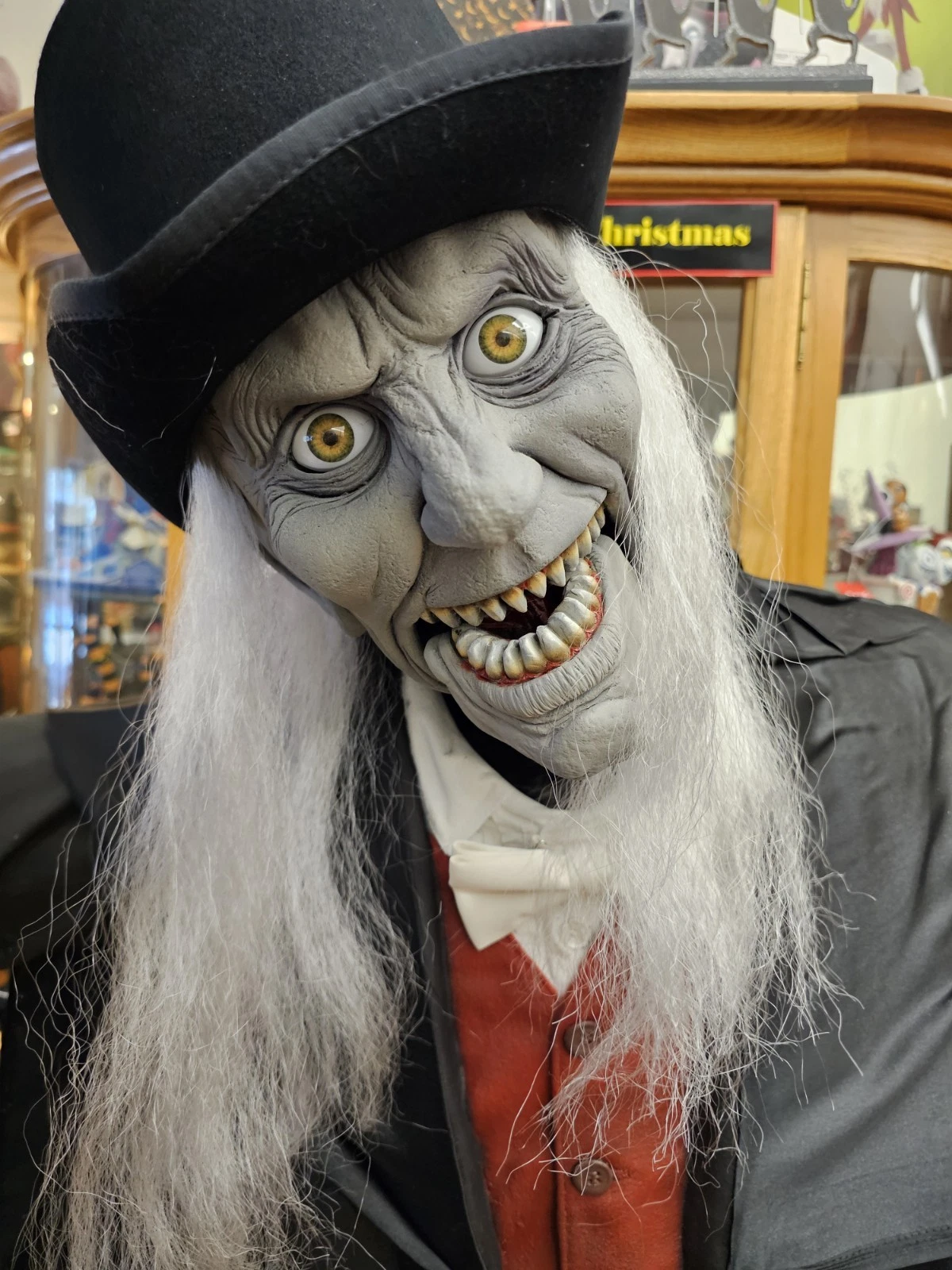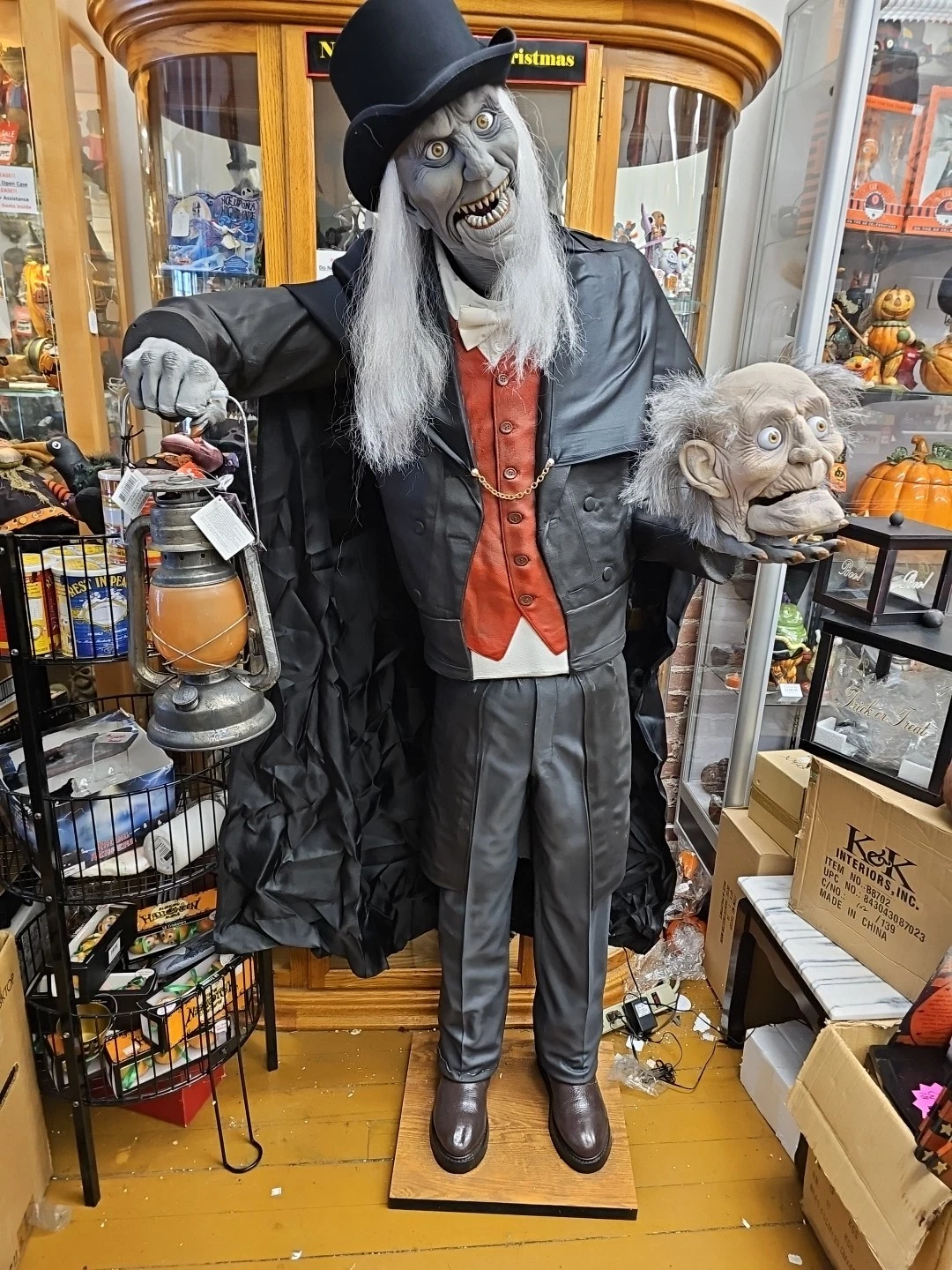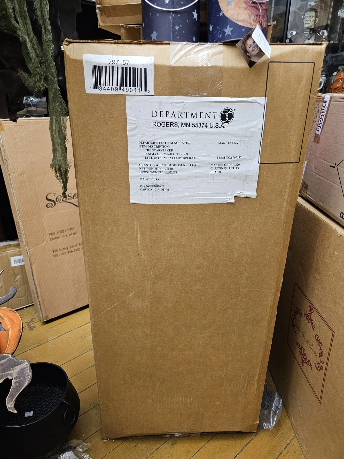 We can’t believe we just unburied these retired Department 56 from Gag studios lifesize Scaretaker Grave Digger Animatronic. He shakes and the skull in his hand also shakes. This is huge. It’s gonna cost to ship, but he’s cool. We ship Fed Ex Ground to save you money. The box weighs 35 lbs.