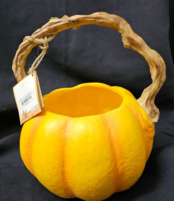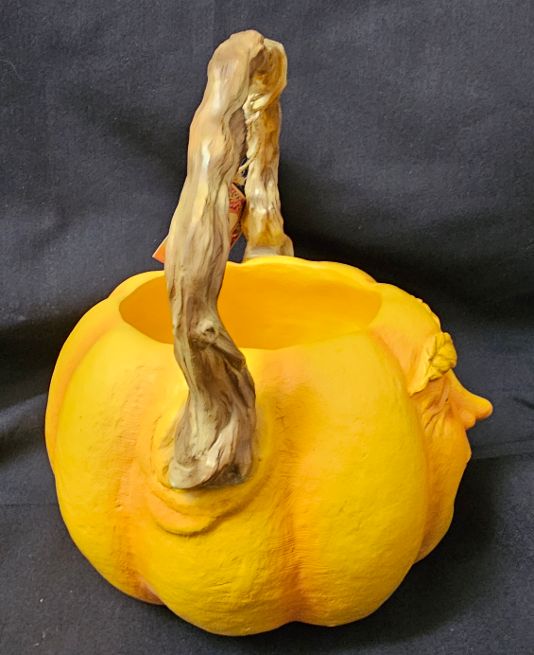 We keep finding collectibles in our 10 warehouses that we have forgotten that we ordered years back. This Ellen Gomoll Orange Peace Pumpkin bowl retired over a decade ago. It is solid and weighs 5lbs before boxing for protective shipping. 10 inches tall by 8 inches in circumference.