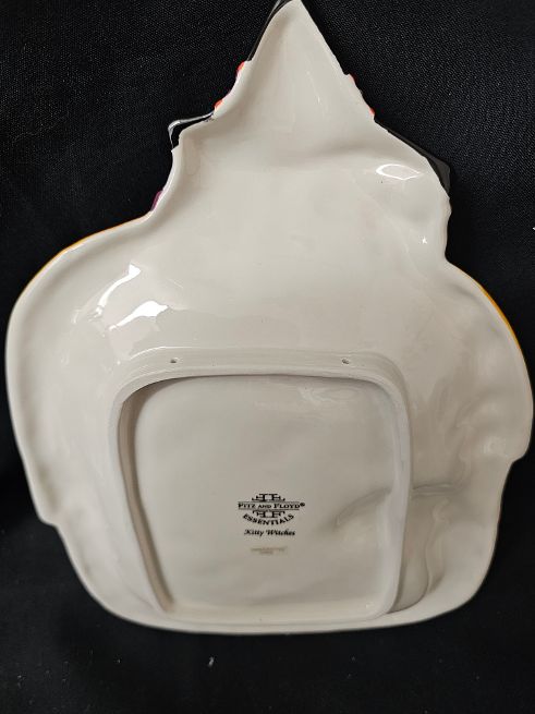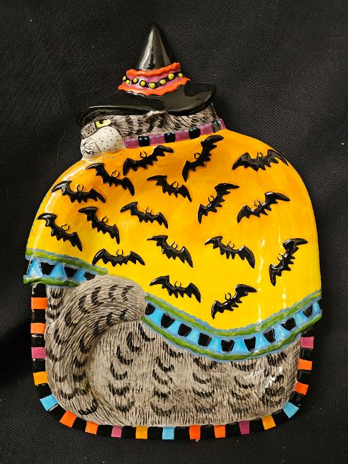 Kitty Witch Canape Plate. Kitty Witch with Bat motif. On the back are two holes for hanging wall plate on the wall. Retired in 2005. Comes in Original Box for gift giving.