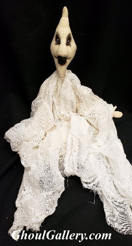 This creatively detailed, painted fabric doll is a cute but Eerie Ghost. He measures about 20″ head to toe.