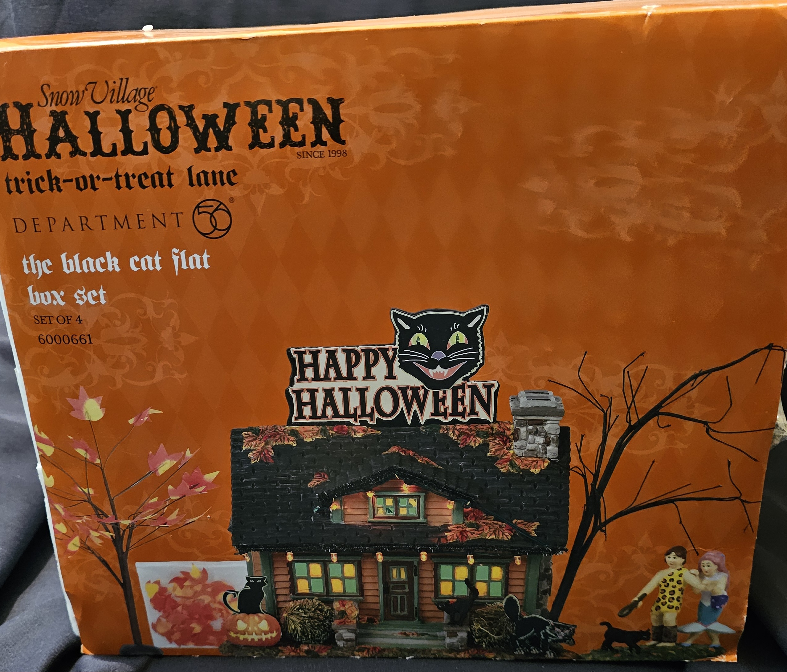 OMG! Another terrific Halloween House by the creative talents at Department 56.. Love the Black Cat touches on this house. (It does not come with the pictured accessory of people.) Introduced in 2018. This house measures 8″ x 8″ x 8.5″. Gift set includes the coordinating accessory “Black Cat Crossing”, extra maple tree, and mini pile of leaves.