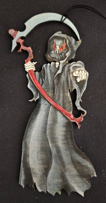 The ornaments created by Jill Ellen Chambers are remarkable. This is her Grim Reaper Ornament. Meticulously Die-Cut, Hand painted, and signed on the reverse, these are limited edition ornaments. Approximately 7 inches. These ornaments are so small and Jill has paid such time-consuming attention to the most minute detail.