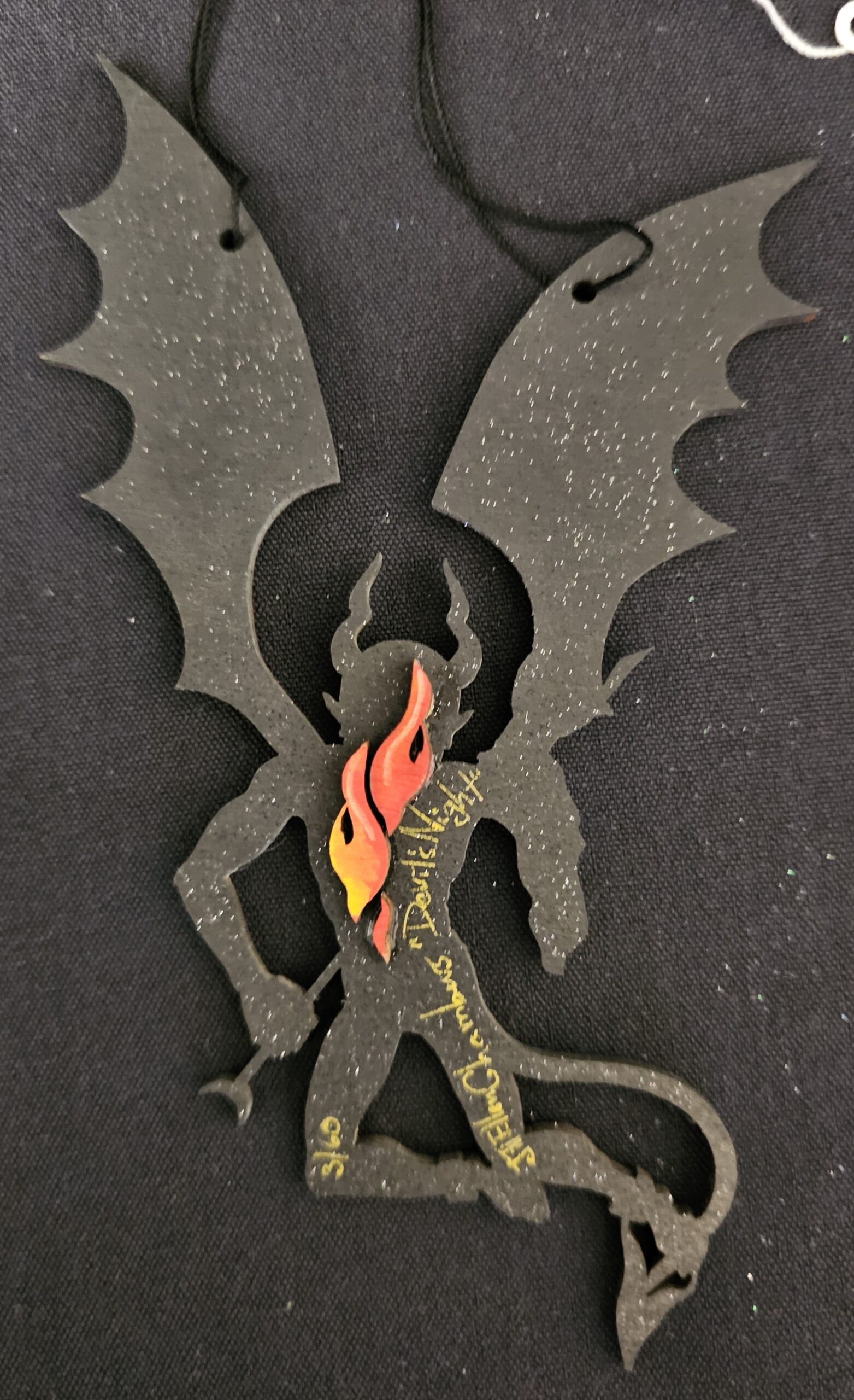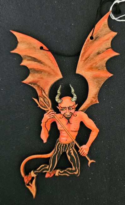 The ornaments created by Jill Ellen Chambers are remarkable. This is her Satan Devil Ornament. Meticulously Die-Cut, Hand painted, and signed on the reverse, these are limited edition ornaments. Approximately 7 inches. These ornaments are so small and Jill has paid such time-consuming attention to the most minute detail.