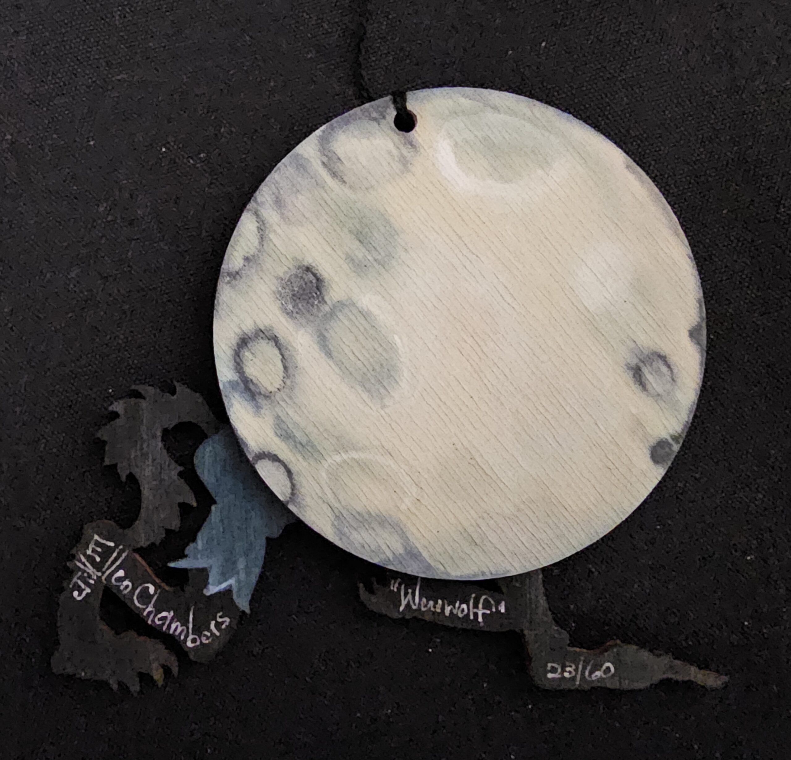 The ornaments created by Jill Ellen Chambers are remarkable. This is her Wolfman Ornament. Meticulously Die-Cut, Hand painted, and signed on the reverse, these are limited edition ornaments. Approximately 7 inches. These ornaments are so small and Jill has paid such time-consuming attention to the most minute detail.