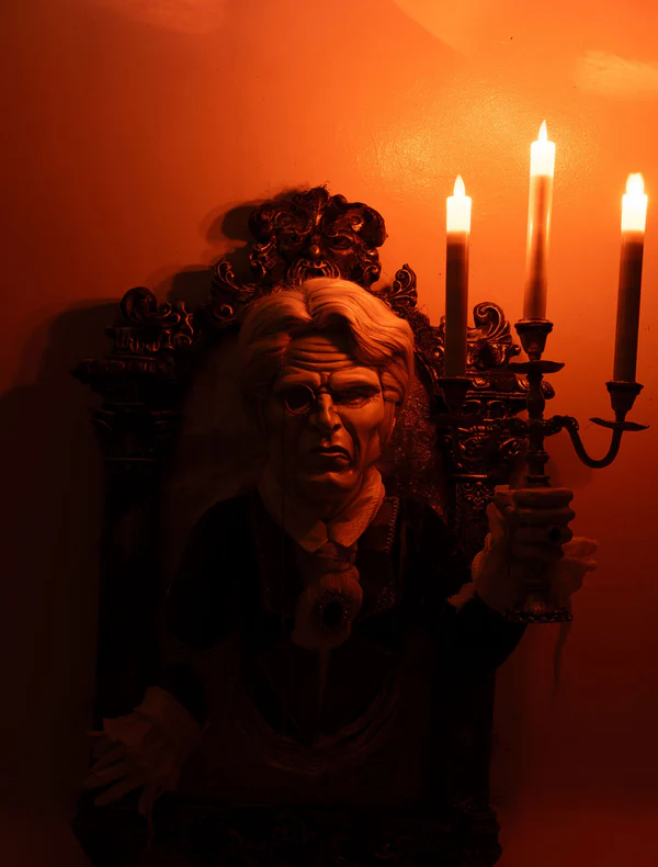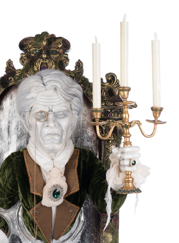 - Stately dressed caretaker in velvet and silk with jeweled broach