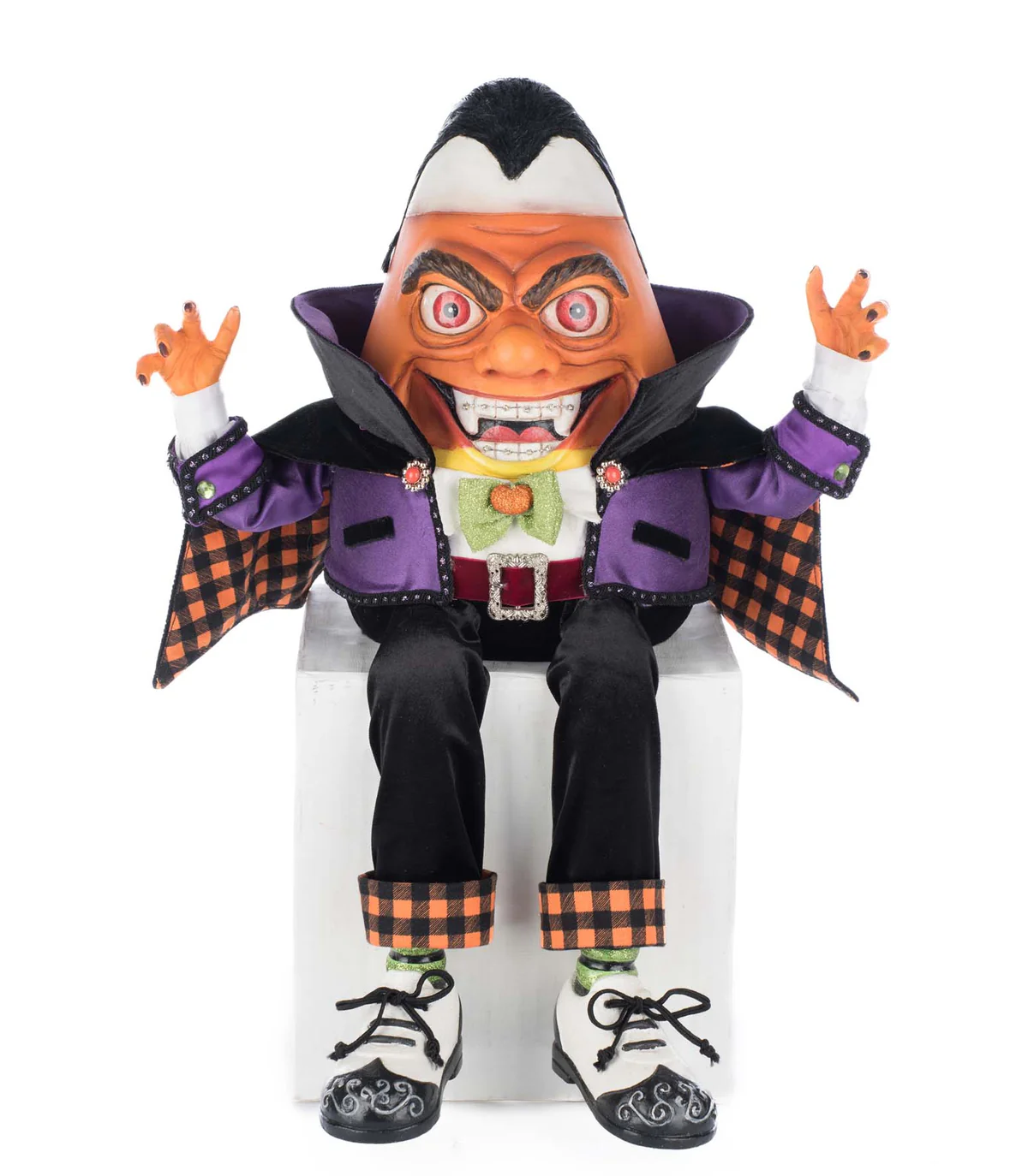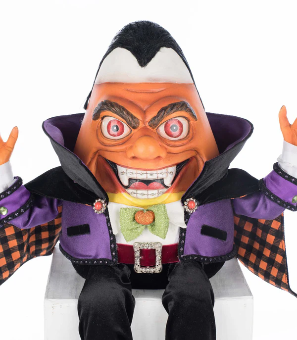 Count Candy Corn Ledge Sitter is a sweet and silly delight, designed like a classic candy corn but brimming with personality! His wide-toothed grin, sharp little fangs, and shiny braces add a hilarious touch. Dressed in plush velvet, orange-and-black buffalo check, and adorned with gems, trims, ruffles, and sparkling accents. Measures 12.5 x 10.0 x 19.5 inches. Introduced in 2025.