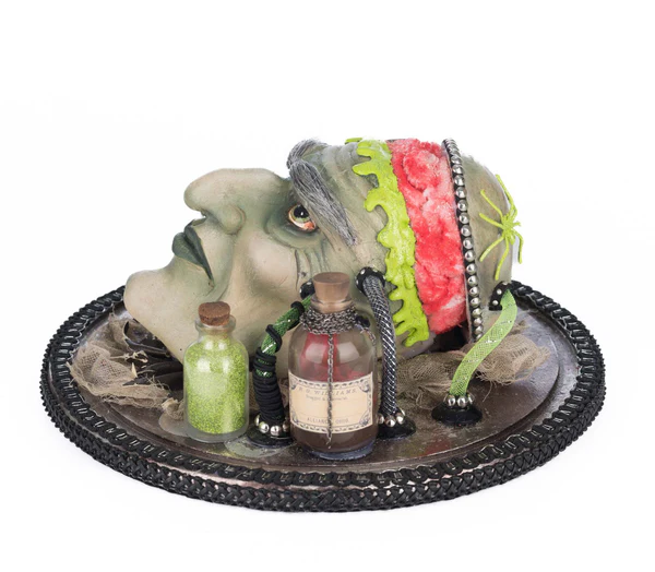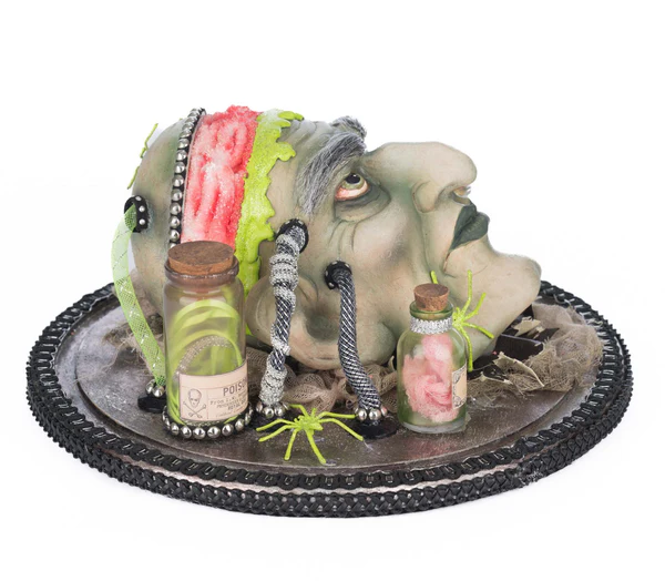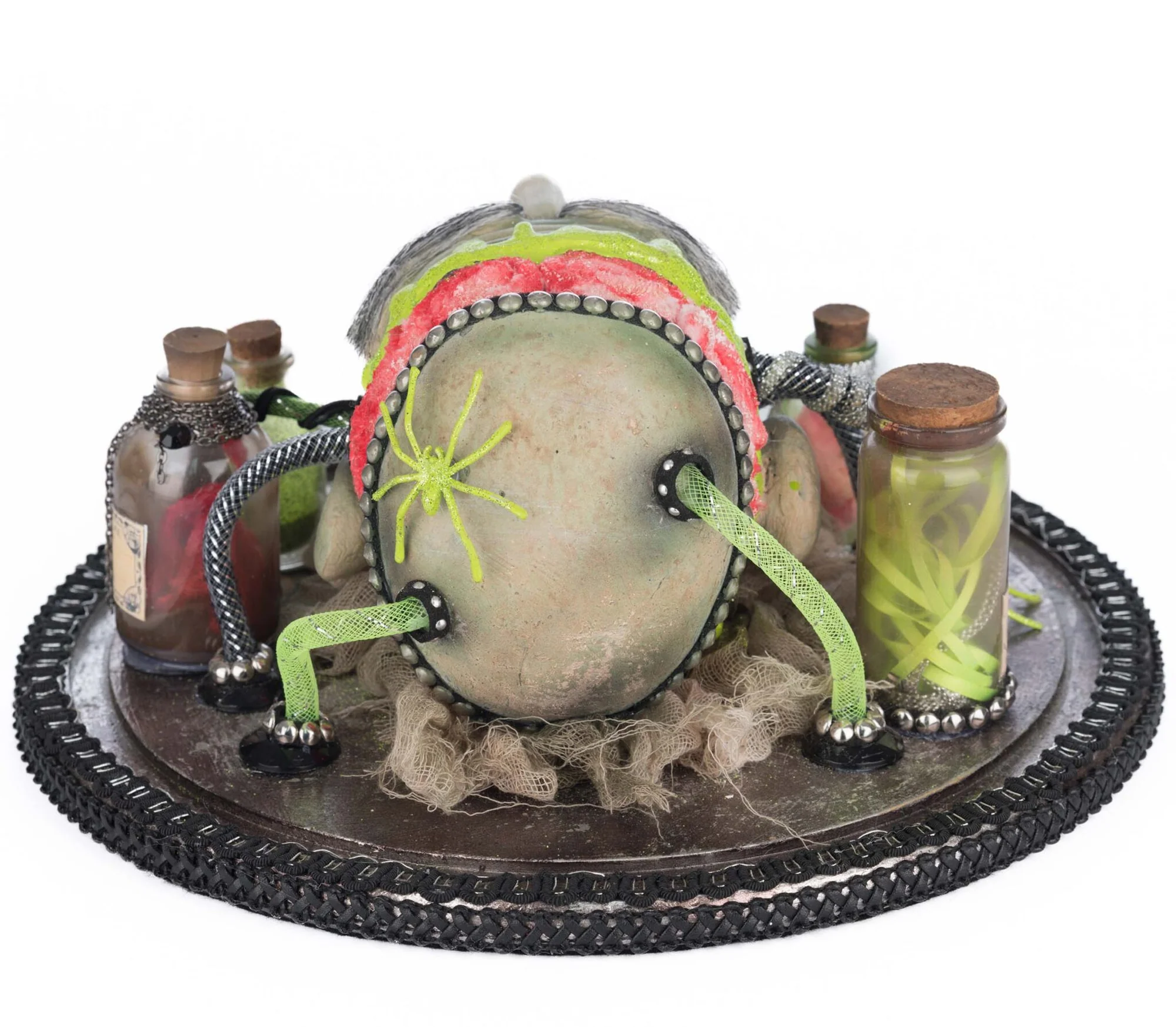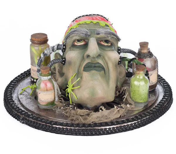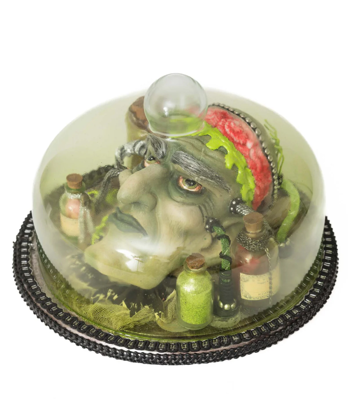 Dinner is Served Frankenstein Server is the ultimate centerpiece. Beneath the green-tinted glass cloche, Frankenstein’s eerie head sits perched on the tray, surrounded by bottles of colorful potions and mysterious and creepy ingredients. Tubes and wires protrude from his neck, a nod to classic mad scientist experimentation. This delightfully unsettling creation guarantees a feast for the eyes. Measures 10.0 x 10.0 x 7.0 inches. Introduced 2025