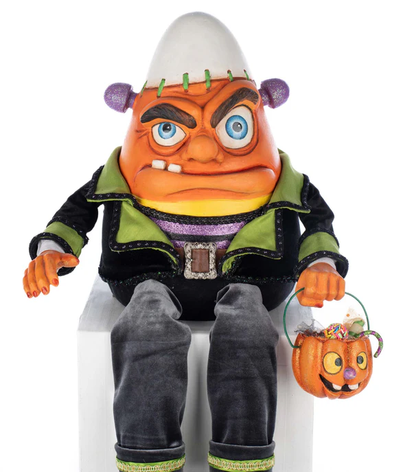 Frankie Corn Ledge Sitter is a whimsically dapper candy corn monster! Dressed in plush velvet and bold buffalo check, he’s adorned with glittering trims, gems, and playful ruffles. With tiny bolts at his head and a mischievous grin, he sits cheerfully on a ledge, dangling soft stuffed legs and clutching his pumpkin candy pail. Measures 12.5 x 10.0 x 19.5 inches. Introduced 2025