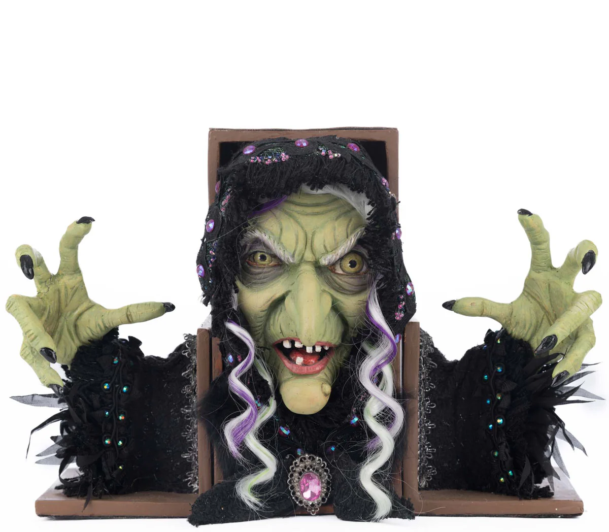 Grizelda Book with Bookends is a spellbinding spectacle, where literature and enchantment collide. Sculpted and hand-painted resin books create a mystical backdrop, adorned with glittering details and jeweled embellishments. As if breaking free from the pages themselves, Grizelda emerges in mid-leap, bringing an eerie sense of magic to any bookshelf. Measures 13.0 x 7.0 x 9.0 inches. Books are not included.