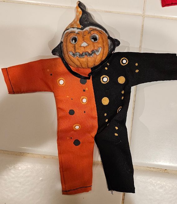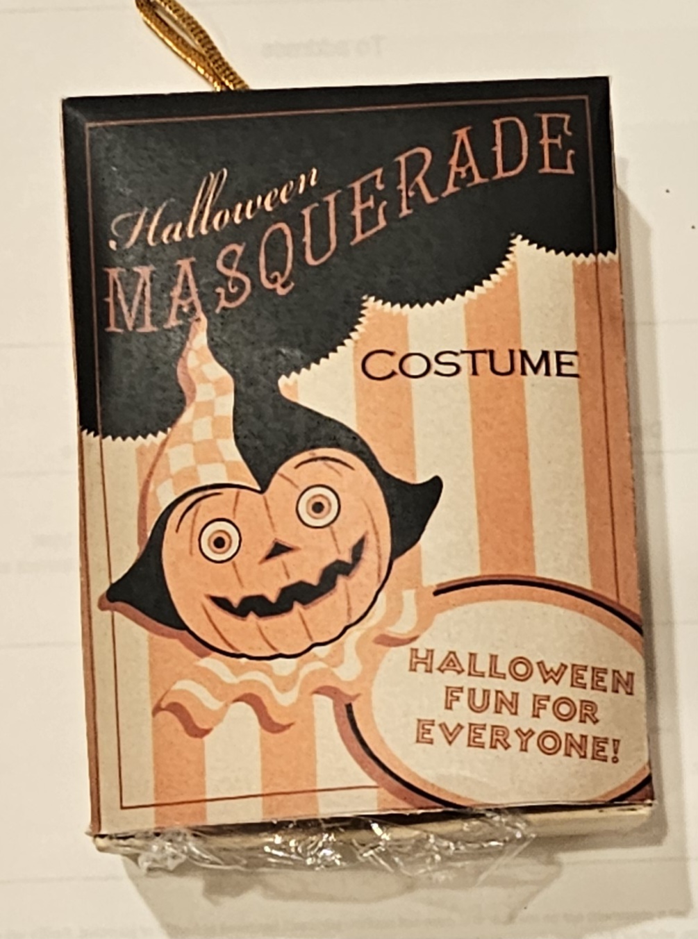 This is for the Pumpkin Costume. We thought we had sold out of this set years back. We have two sets, so one will be sold as a complete set of Scott Smith’s amazing costume ornament set, while the others will be listed as one each. They come complete in their own little costume boxes, These have been long retired. They measure about 4 to 5 inches on their little hangars. They are soft cloth material on wire hangars. Anything by Scott Smith’s Rucus Studio is in high demand due to his originality. His auctions on his personal site, go in the thousands. These were produced by Bethany Lowe in 2007.