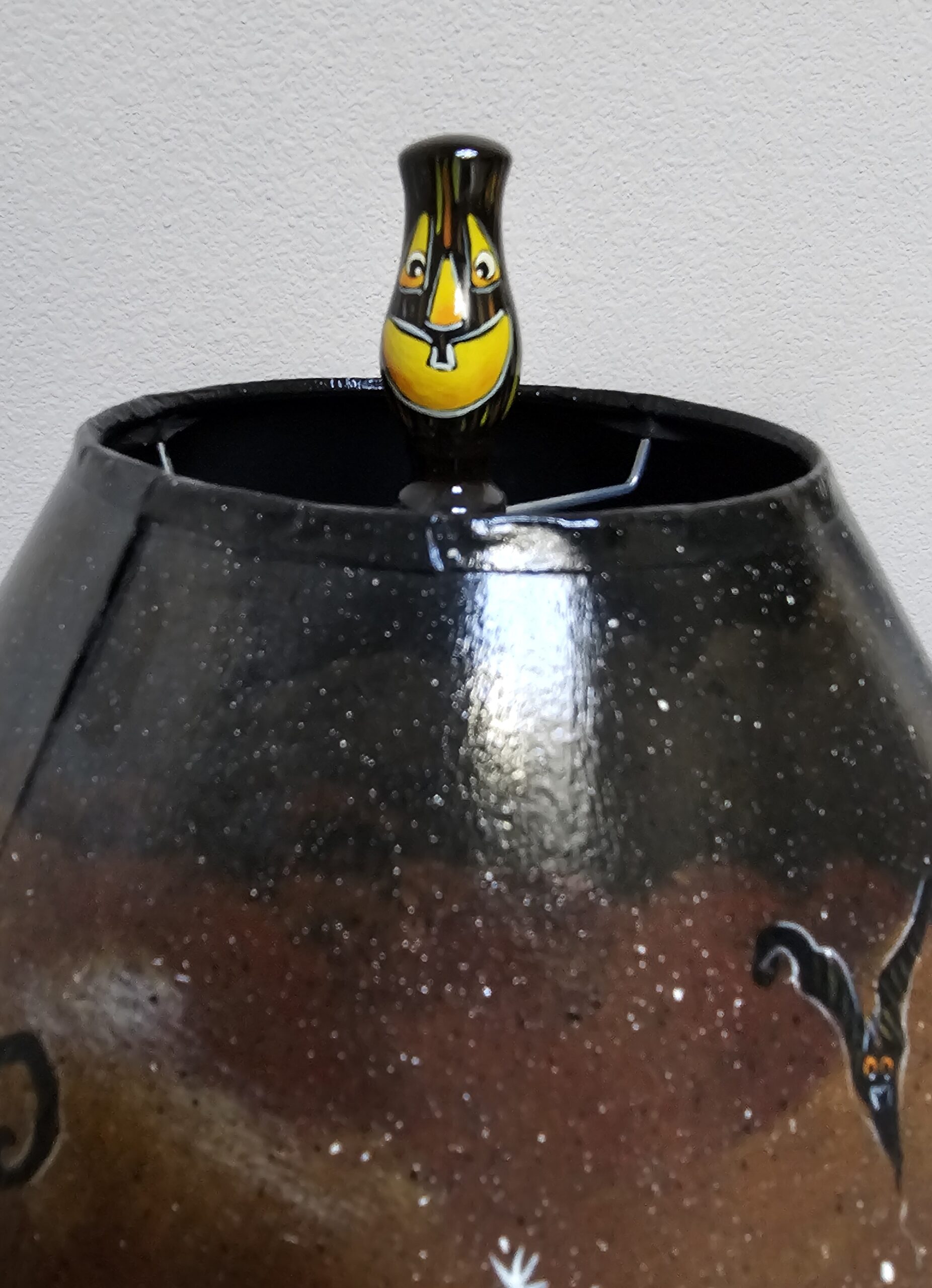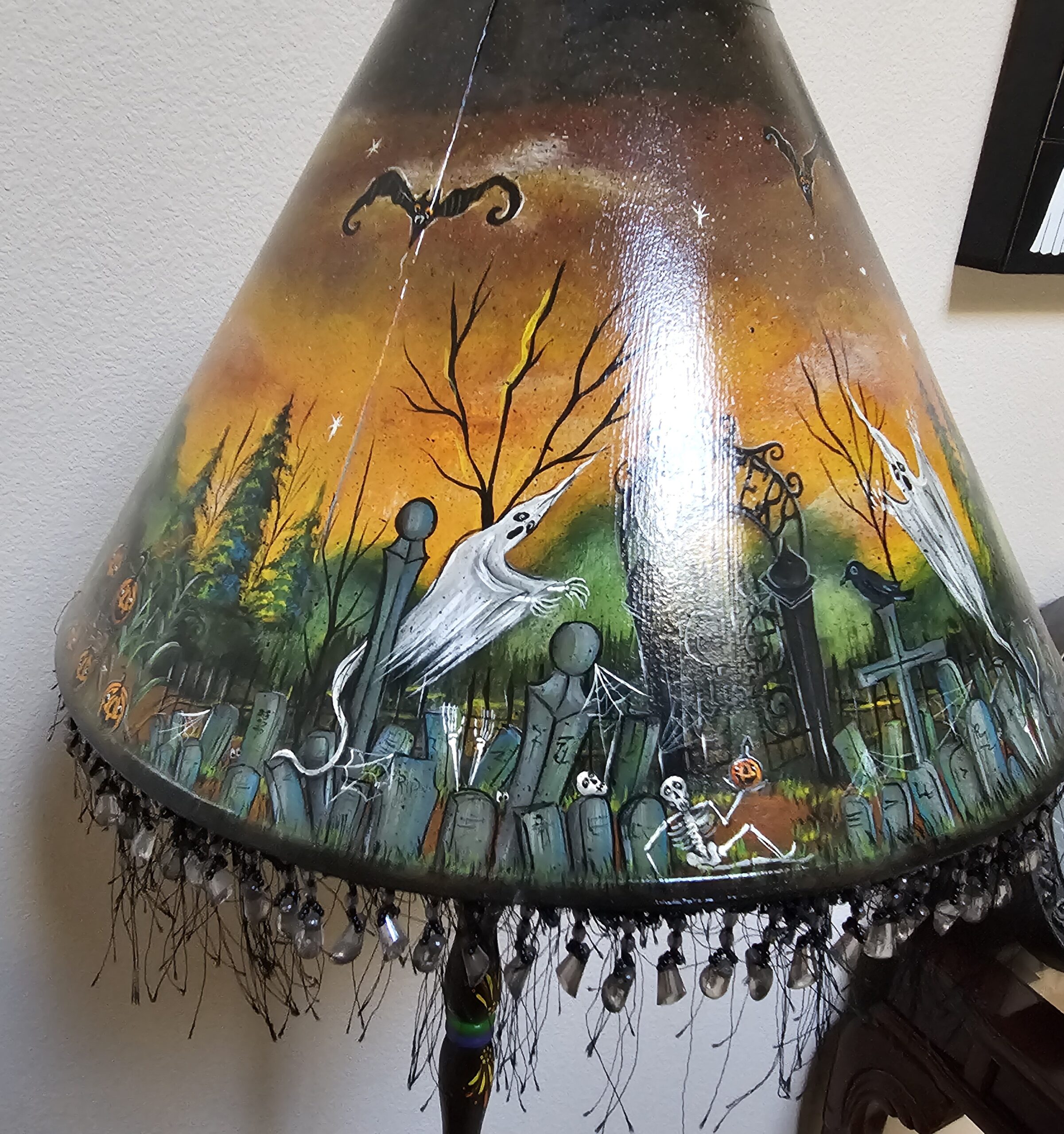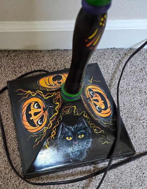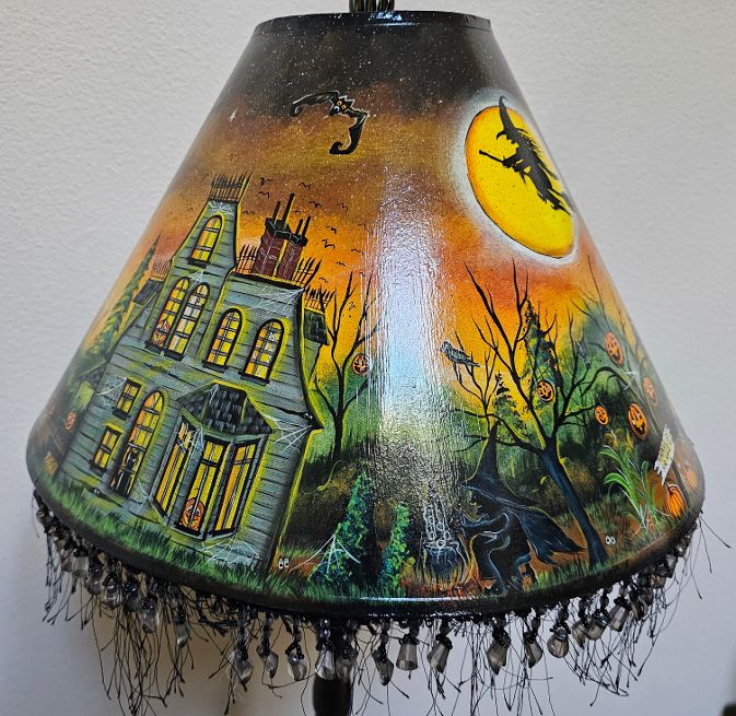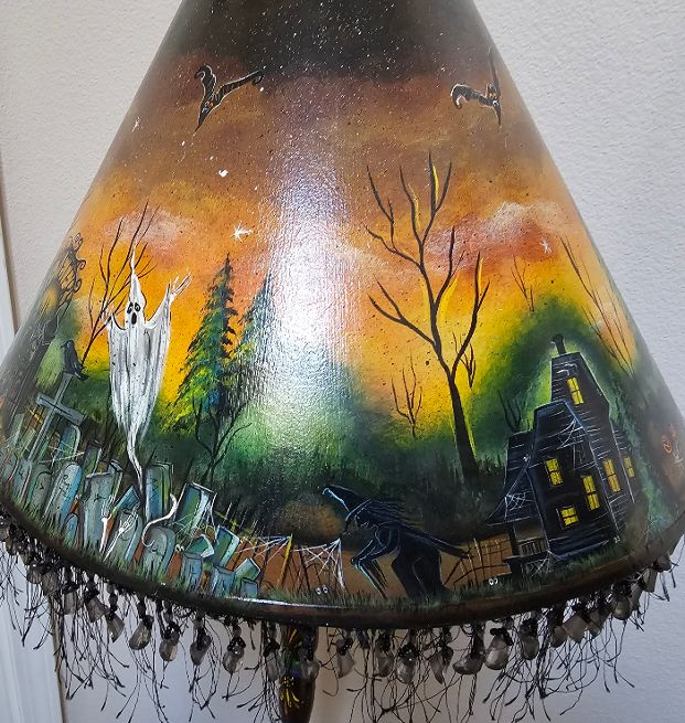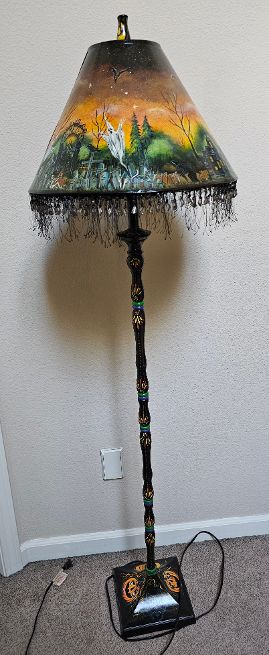 This Floor Lamp is one of a kind created by Spookylvania is an incredible work of art. The floor lamp unscrews at various levels for easy shipping. The lamp shade is painted with spooky creative designs all the way around, and she has added a fringe at the bottom of the lamp shade. Check out the bottom, with the various designs that Spookylvania has added to each quarter of the stand. This stands 60″ tall, the lamp shade is 11 tall by 16″ diameter wide at the bottom of the shade.