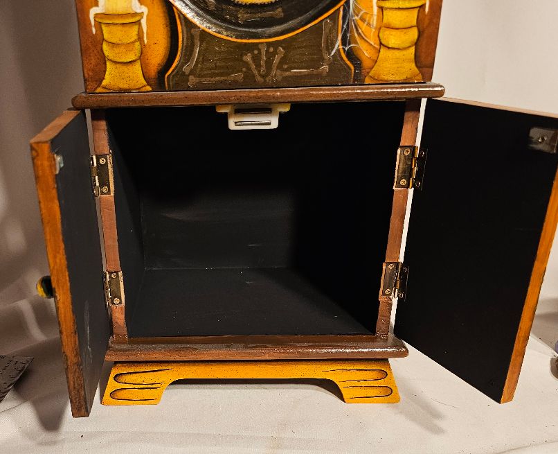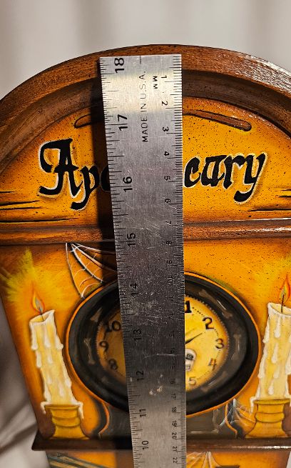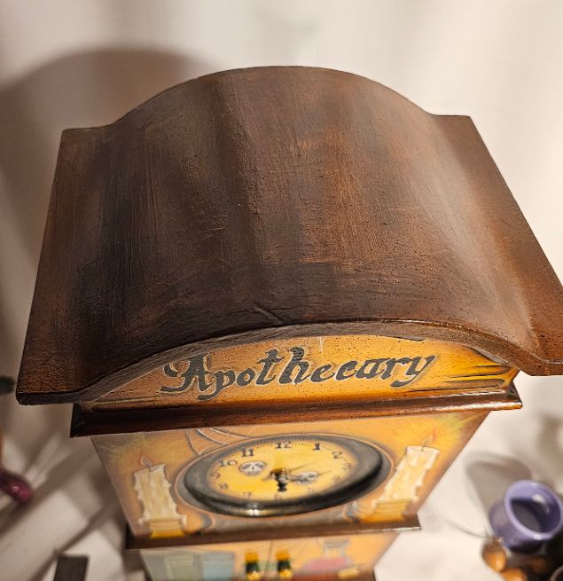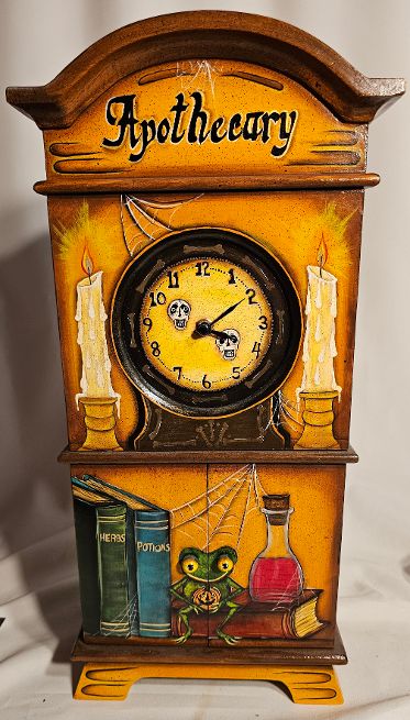 Wow! It takes someone with great vision to see a plain clock, and envision what it could be once it gets into the hands of creative artist. What must have gone through the mind of Spookylvania to see an Apothecary with a front door where the frogs eyes are the little buttons to open the doors to the inside apothecary. And the attention to each side with all kinds of books. What an imagination! From the addition of spider webs and candles, this 18″ mantel clock has it all. This one of a king original will arrive with a certificate of authenticity. It will be wrapped in tissue and bubble wrap to protect it during transit. Insurance is included in this shipment.