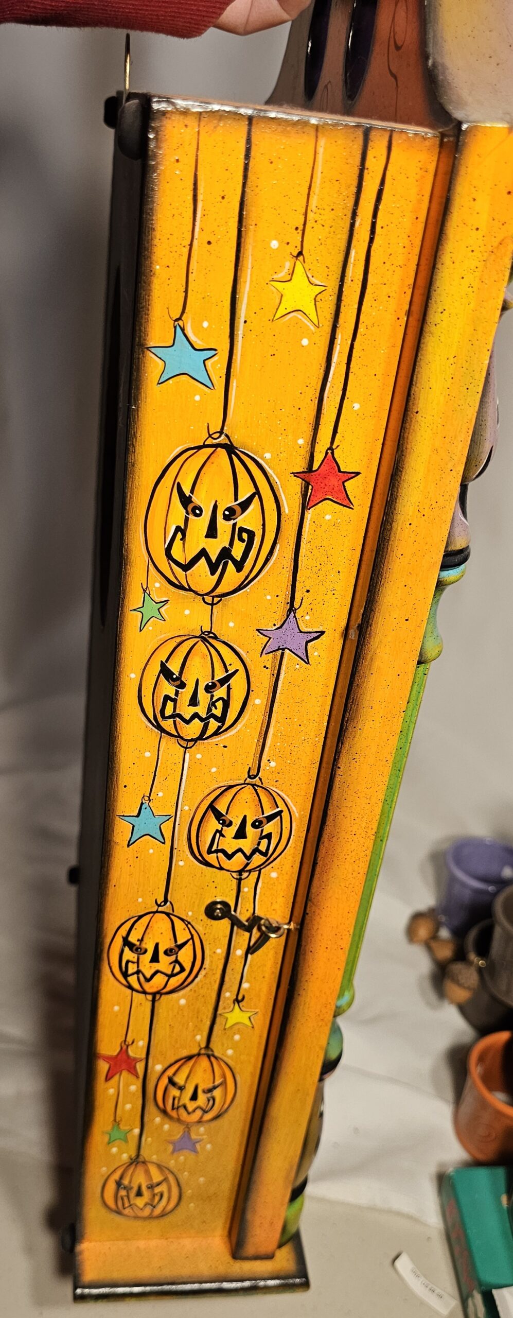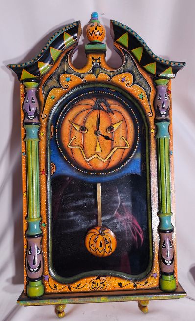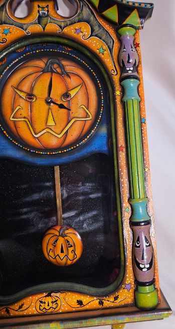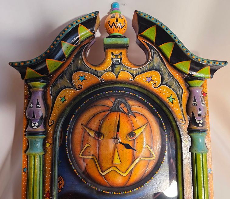 One of the grandest of Spookylvania’s Pendulum Wall Clocks. This measures nearly 18″ Tall and operates a single “AA” battery. every inch is covered Spookylvania’s creativity from the pumpkin face, to the pumpkin pendulum, to the side pillars. The arched top has a bat flying over the pumpkin face. And check out the detail at the very top of the clock and the bottom. We have have added extra photos of all the attention to detail by Spookylvania. Because this is an original it will be accompanied with a certificate of authenticity. It will be packed well with tissue and bubble wrap. Due to the size of this clock, it will be shipped in an oversized box. Shipping Insurance is included with this magnificent piece of art.