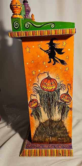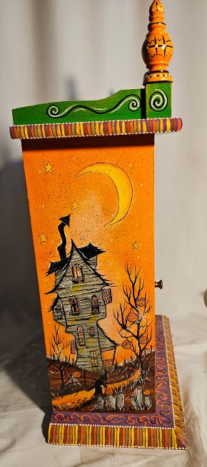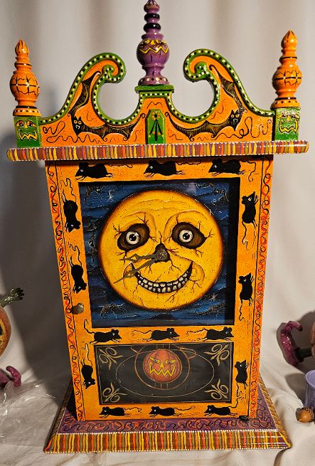 Spookylvania was an incredible artist, so detailed in what she produced. Ghoul Gallery was her exclusive Retailer in the United States. Each clock was meticulously hand painted from her own original artwork. She would take existing clocks and lamps and re-imagine them as you see today. With a large Moon as the face of the clock, she has added detail to the top, bottom, sides and even the swinging pendulum.
