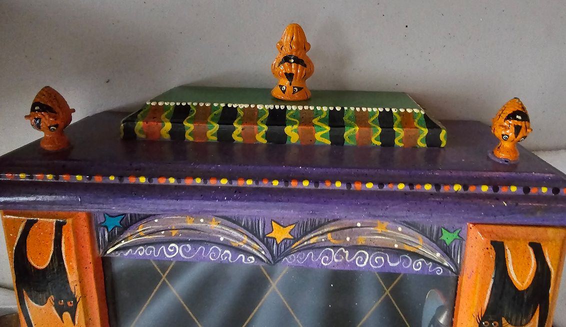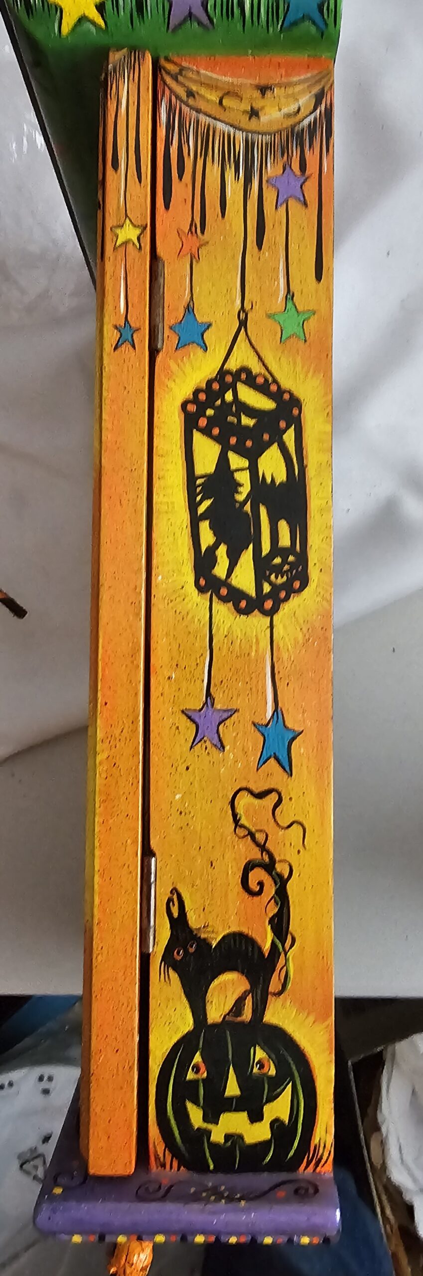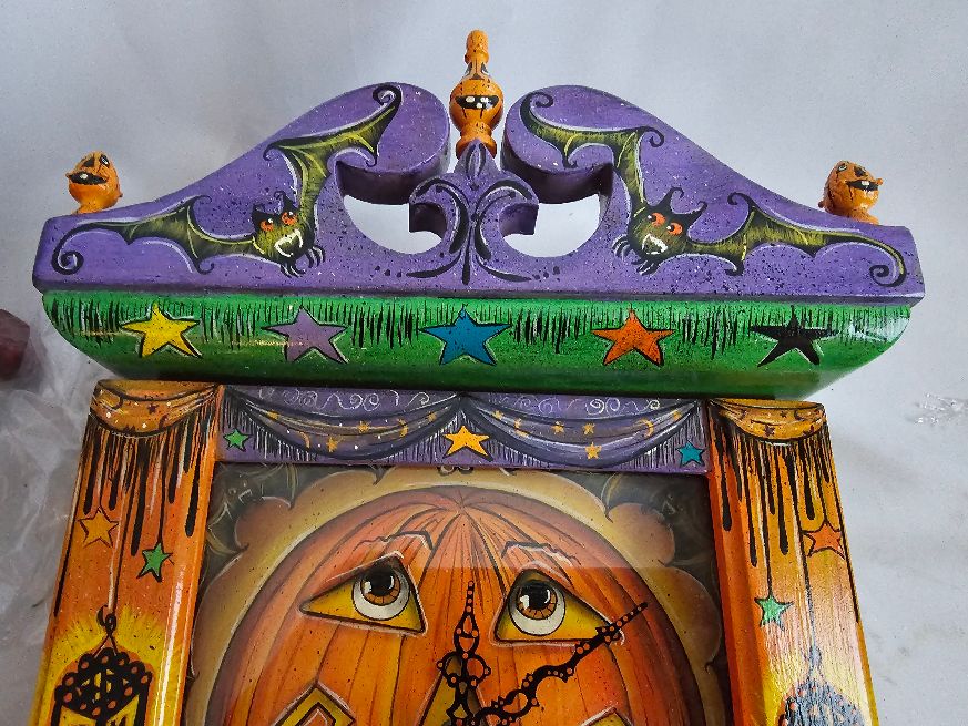 Spookylvania was an incredible artist, so detailed in what she produced. Ghoul Gallery was her exclusive Retailer in the United States. Each clock was meticulously hand painted from her own original artwork. She would take existing clocks and lamps and re-imagine them as you see today. With a large pumpkin as the face of the clock, she has added detail to the top, bottom, sides and even the swinging pendulum designed as a black cat.